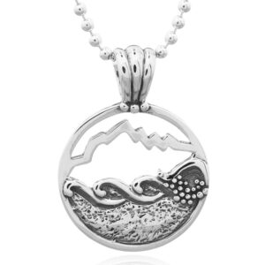 Name: Mountain Sea Sterling Silver Pendant SKU: 34610 Material: 925 Sterling Silver Finish: Oxidized Weight: 2.2 g Dimensions (WxHxD): 14 × 23 × 5 mm IN-STOCK MOQ: 3 OUT-OF-STOCK MOQ: 20