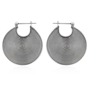 Name: Vintage Sphere Wheel Silver Hoop Earrings SKU: 14571 Material: 925 Sterling Silver Finish: Oxidized Weight: 6.5 g Dimensions (WxHxD): 1.7 × 23 × 23 mm IN-STOCK MOQ: 2 OUT-OF-STOCK MOQ: 10