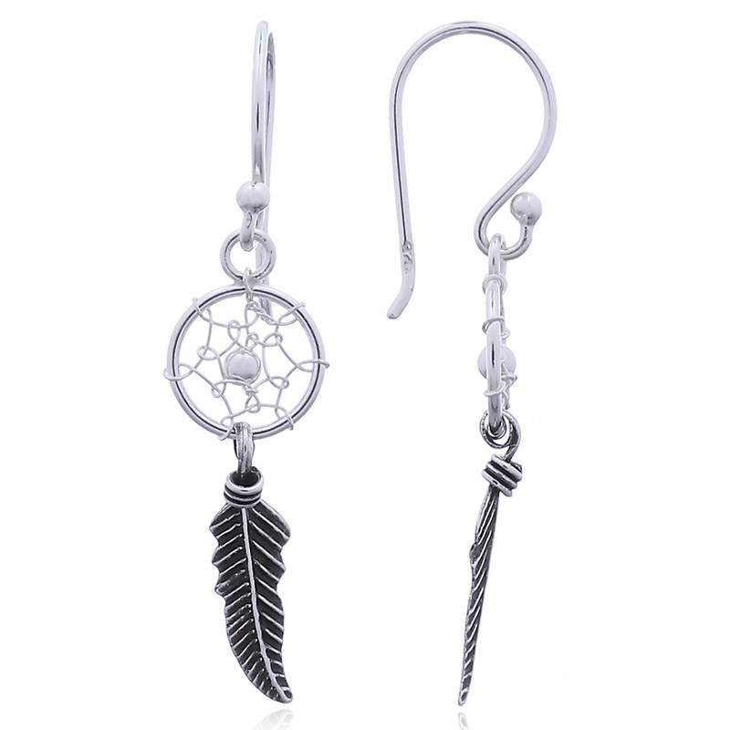 925 silver dream catcher earrings of 8 mm in diameter show a polished silver bead trapped in a silver wire net and antiqued silver feathers dangling from the bottom. Native American inspired silver jewelry that shows a great lever of workmanship.