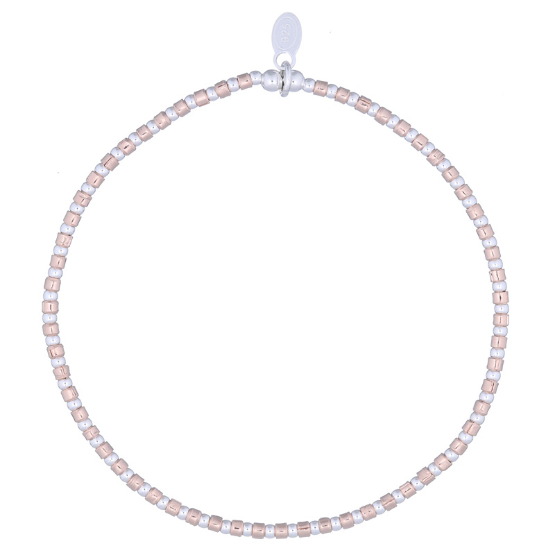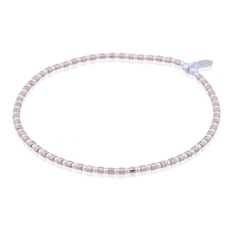 Stretchable bracelet made of 2mm rose gold plated tube beads and 3mm 925 round beads. Minimum length: (18 cm).