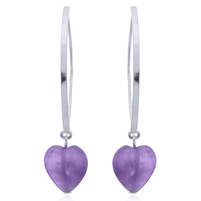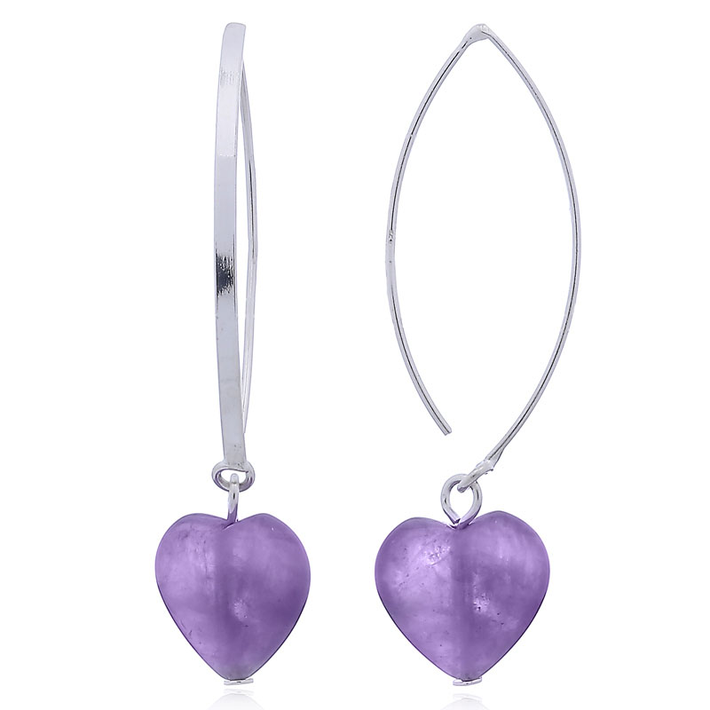 Cut and polished cabochons of Amethyst in the form of sweet gemstone hearts are here presented to admire their vivid violet color. The silver bead at bottom holds the silver thread in place that connects the bail which is attached to the gorgeous softly curved delicate stick hangers. Fashioned in Sterling Silver and handcrafted this cute jewelry makes romance to a feast.
