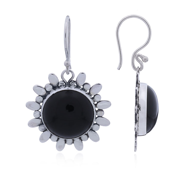 Black Agate Sterling Silver Dangle earrings feature polished round cut Black Agate cabochons surrounded by hand soldered brightly polished Sterling Silver petals that compose this beautiful pair of earrings that dangle on swing loops. Adorable gemstone silver jewelry presents handmade feminine cute earrings to embellish women of all ages.
