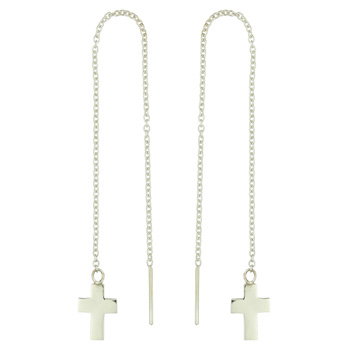 Stamped flat crosses of Christianity sway from one end of a length of sterling silver cable chain while on the opposite end small silver posts interact with the chain and crosses with every movement. The chain itself is able to thread completely through piercings and allows the wearer to choose the length by pulling front or back.