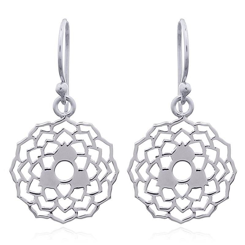 Thousand petaled flower earrings is Crown chakra Sign which have the meaning Consciousness and Spirit. Highly polished sterling silver dangle earrings.