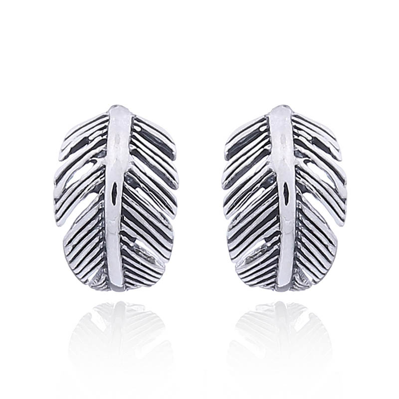 Delightful pair of 925 silver stud earrings featuring a pair of polished silver feathers that curl gracefully. Oxidation has been added to the silver in the right places to give the design more definition. These wholesale silver feather stud earrings are a great addition when creating a silver feather jewelry line.