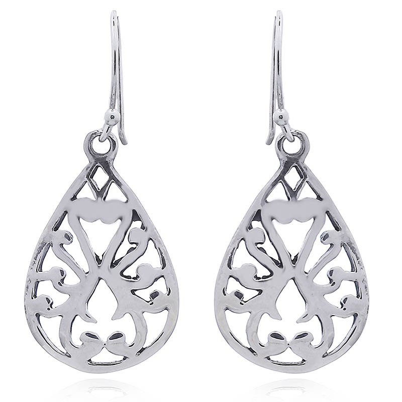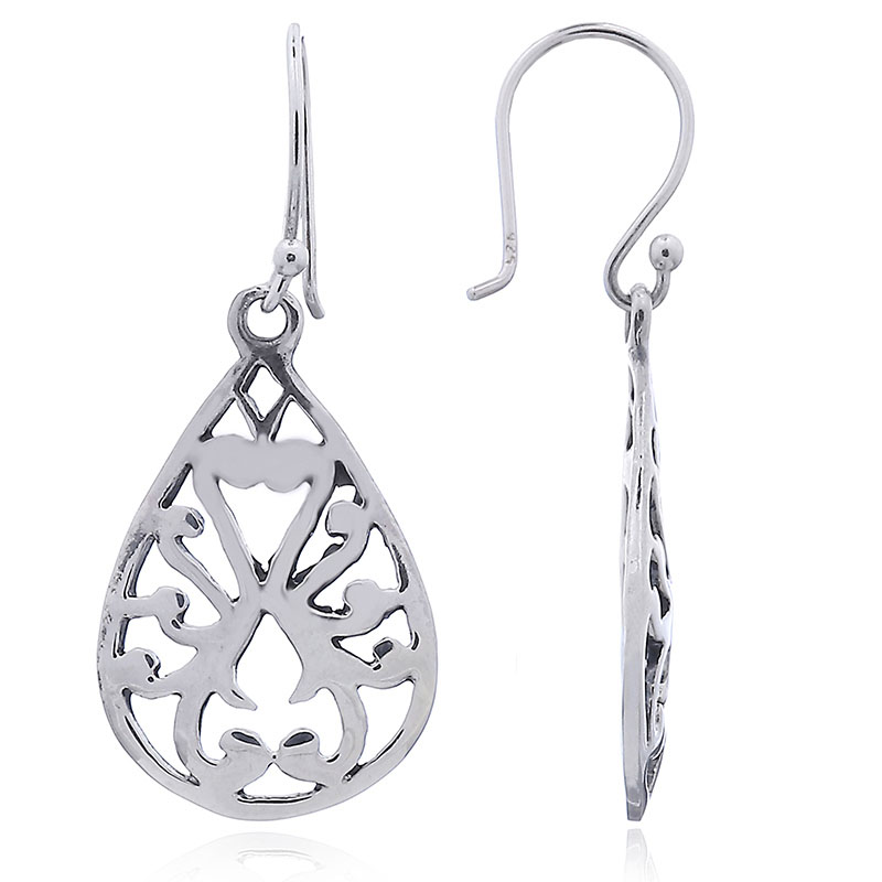 The softly curved drop shape is filled with leaf tendrils that are created by the Ajoure Sterling Silver an airy and delicate earring design with a convex surface is the result. Symmetrical arranged ornaments and the timeless drop shape create earrings that are fit to accentuate a evening gown with ease.
