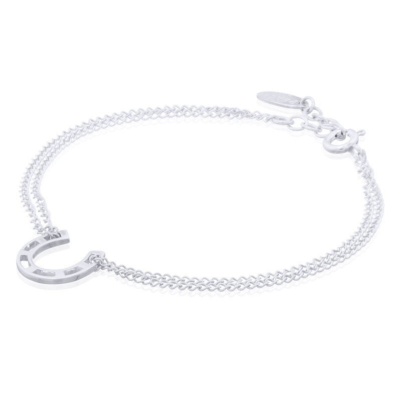 Two lengths of beautiful curb chain wrap around two holes of a Silver horseshoe charm uniting again at the links of a silver spring clasp. The horseshoe is considered a good luck charm since it is believed to fill up with good fortune when its ends are hung pointing upwards. There is an extra 3 cm of chain dangling from one side of the spring clasp for the user to adjust the length of the bracelet. (Dimensions of horseshoe charm 12 x 12 x 1 mm).