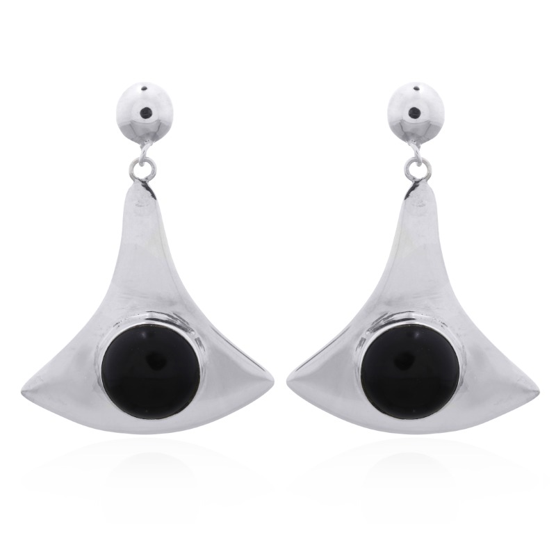 Precious shining fan shaped Hallmarked 925 silver earrings are embellished with bezel set round cut Black Agate cabochons that rise from out the silver surround. Dangling on semi-spherical post these silver gemstone Stud earrings are highly elegant and matched with the pendant Product ID: 74241 a sophisticated set can be worn by women with high expectations. This handmade silver gemstone jewelry sets its accent when flattering the features with its modern stylish flair. Secured with silver butterfly backs.