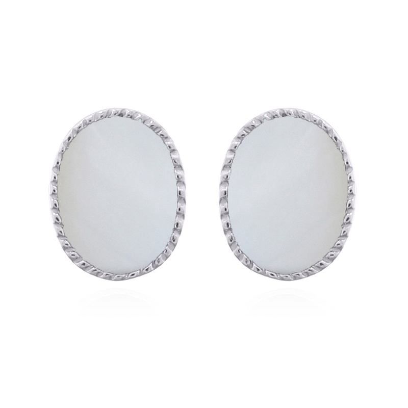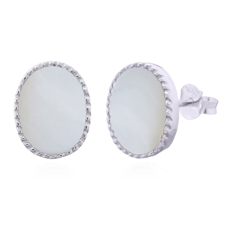 These stud earrings feature oval-shaped Mother of Pearl set in smooth, serrated-edge 925 sterling silver bezels. Their sophisticated design offers retailers a unique blend of natural beauty and refined craftsmanship, perfect for customers seeking timeless statement pieces.