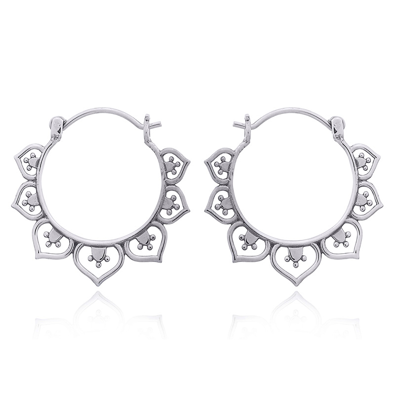 These lotus flower hoop earrings are made completely in sterling silver. These earrings display a conceptual lotus flower their petals gracefully adorning the outer ring of each hoop decreasing in size as they approach the lever closure.