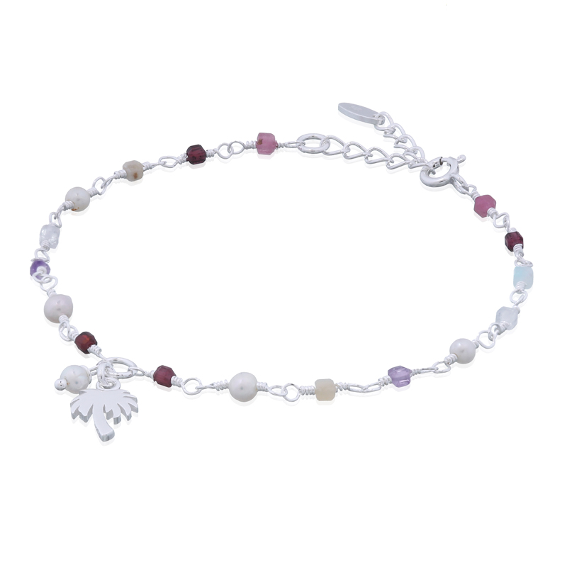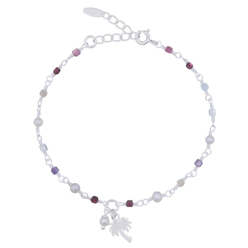 This 925 sterling silver bracelet showcases faceted amethyst, amazonite, rhodonite, moonstone, tourmaline, grass beads, freshwater pearls, and a playful silver coconut tree charm. Ideal for retailers seeking premium, layered pieces that captivate customers with eclectic sparkle and tropical-inspired elegance.