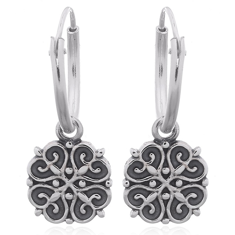 The floral ajoure antiqued silver hoop earrings offer a vintage-inspired, detailed design that adds a touch of romantic elegance. Perfect for retailers targeting customers who love intricate, statement pieces.