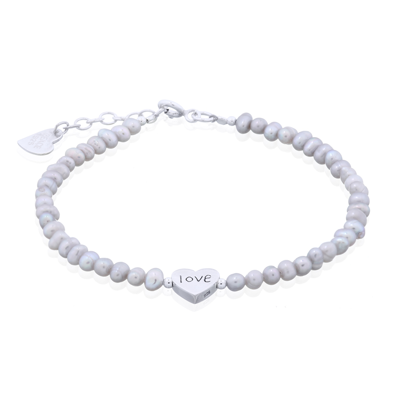 Two dainty Silver Spheres flank a highly polished Silver Heart which shows the word “love” on its surface. Freshwater pearls available in three different colors embellish the length of the bracelet with their alluring luster: white, gray and dark green. A silver chain linked to one end of the bracelet allows the user to extend its length. (Pearl Size: 3 mm). (Chain length: 3 cm extra).