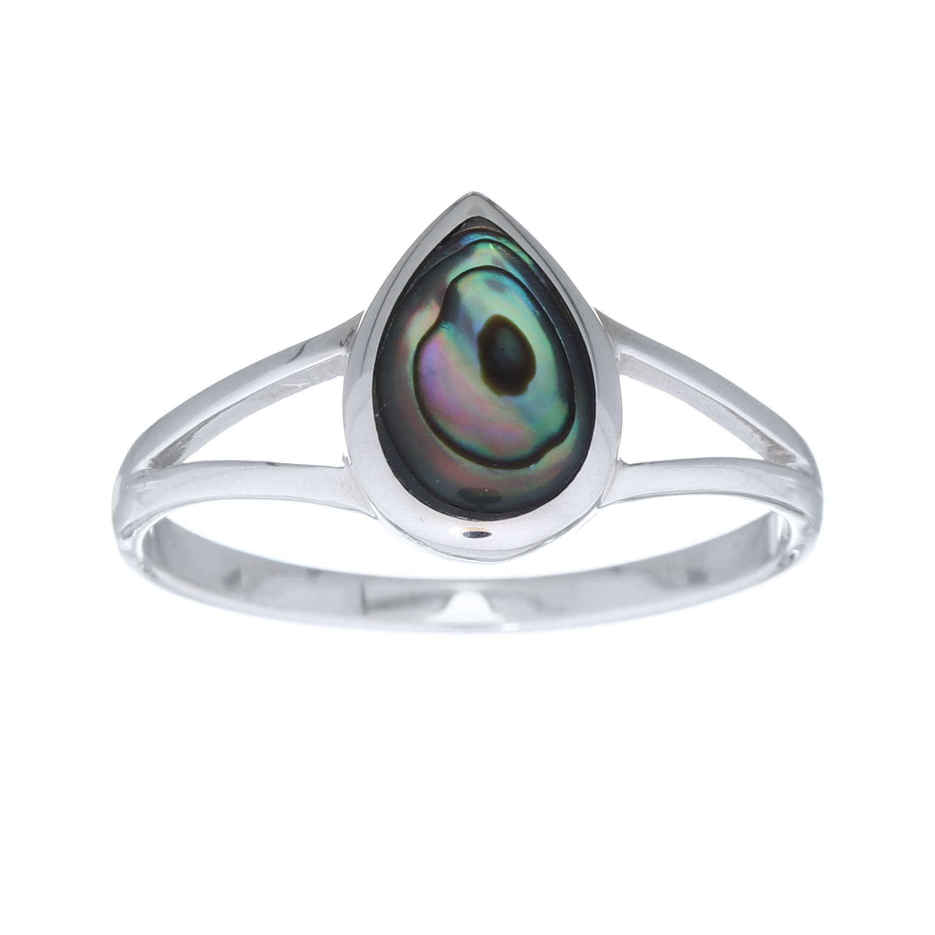 This elegant 925 sterling silver ring features a raindrop-shaped abalone shell inlay secured in a bezel setting, complemented by a stylish split shank band. Retailers will find it perfect for customers seeking delicate, nature-inspired jewelry with modern flair.