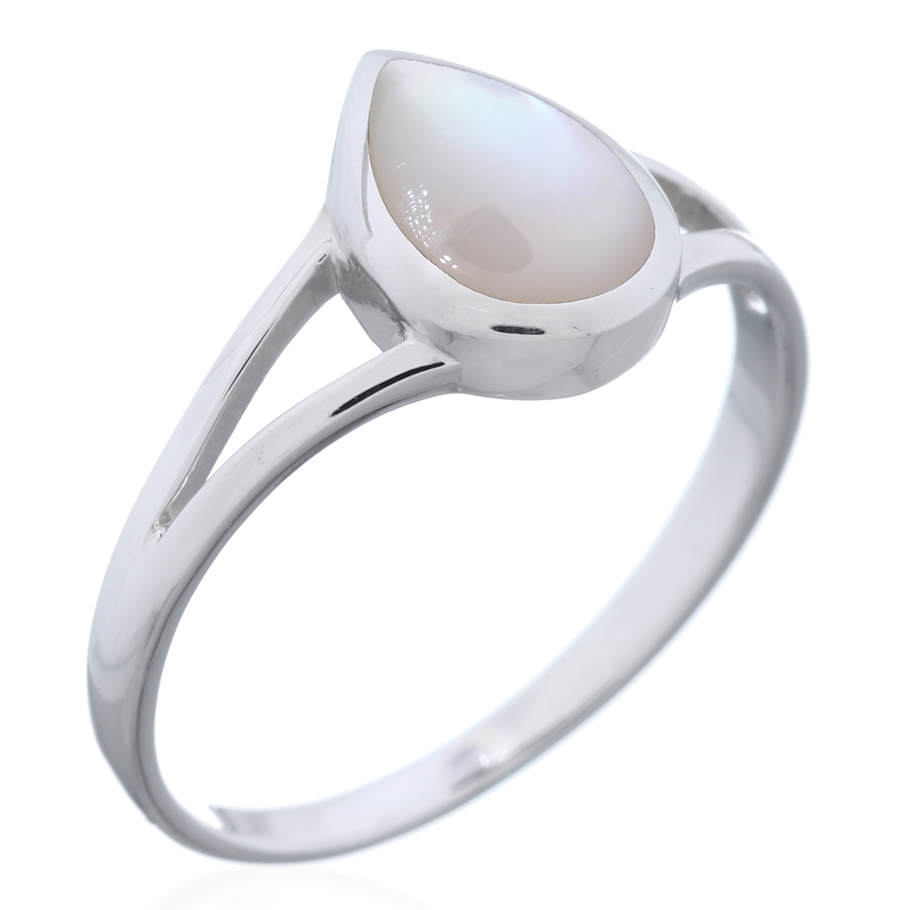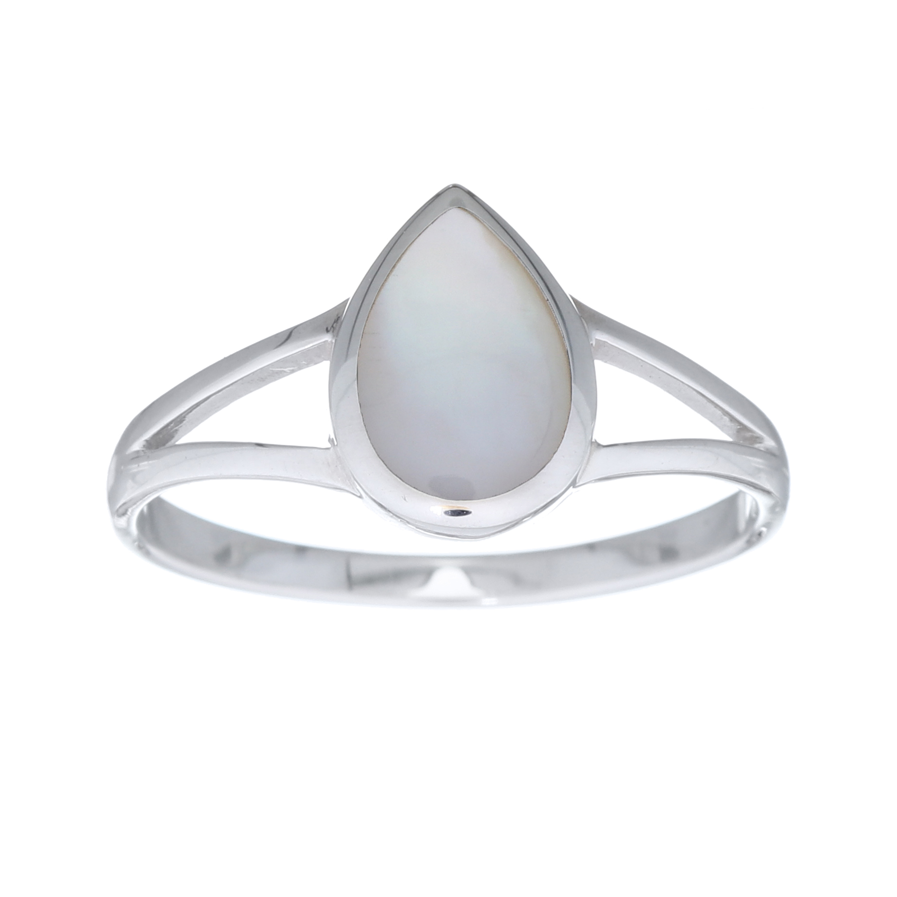 This elegant 925 sterling silver ring features a raindrop-shaped mother of pearl inlay secured in a bezel setting, complemented by a stylish split shank band. Retailers will find it perfect for customers seeking delicate, nature-inspired jewelry with modern flair.