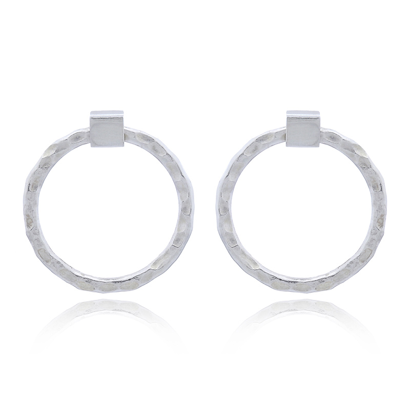 Hammered textured silver stud earrings shaped in circle doughnut.