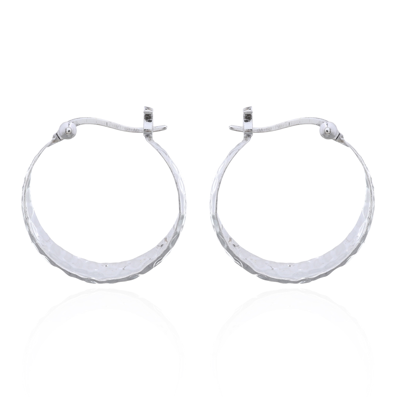 Hammered plain 925 Sterling Silver convex Hoop earrings add a tasteful and classic style to the looks with their gorgeous gradually tapering shapes that surround the earlobe with a spectacular sparkle and shine. The light breaks on the hammered surface delightfully adding a charming rich feature to these elegant silver hoop earrings. This is timeless plain silver jewelry that will still be beautiful in many years from now.