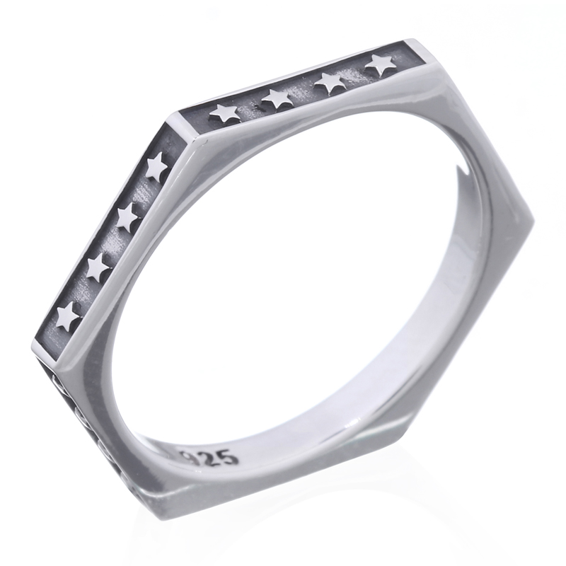 Featuring hexagonal shapes and silver stars in relief, this stack ring offers a celestial touch. Perfect for enhancing your store’s unique selection. Benefit from our product’s unique design.