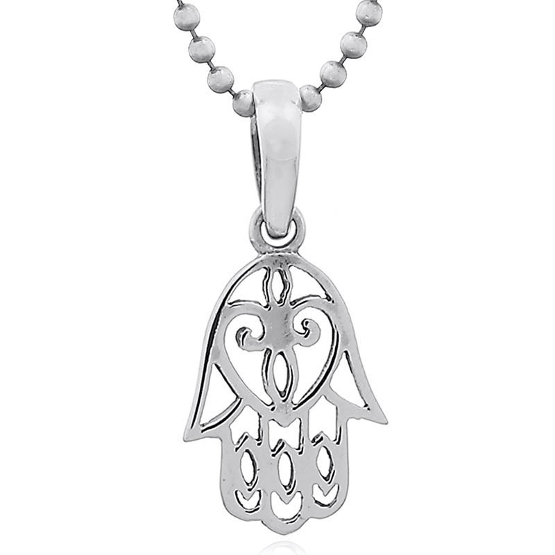 Hamsa pendant or hand of Fatima as it is also known is a talisman of old that according to ancient belief is a protector against all and any negative energies. The 925 silver lines on the open and airy design of the palm show a curled heart shape. Unique Hamsa silver pendant made with care by skilled workers.