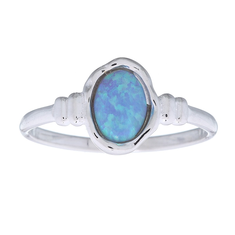 This 925 sterling silver ring features an irregular oval synthetic blue opal in a secure bezel setting, offering a play of iridescent colors. Perfect for retailers seeking unique, eye-catching pieces that blend organic shapes with modern luxury appeal.