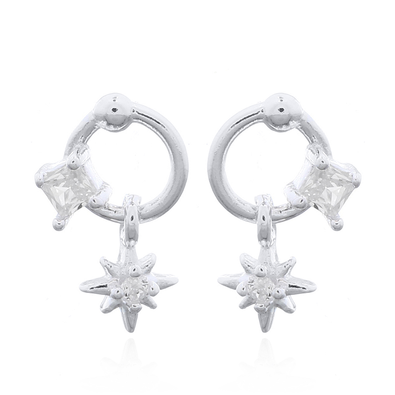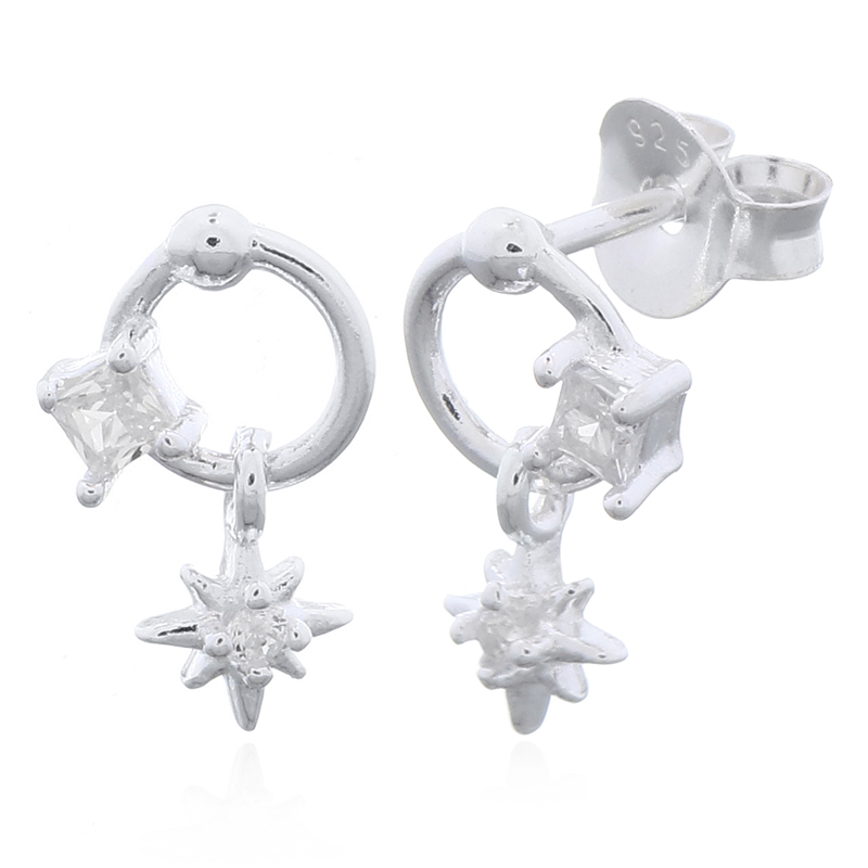 Radiant 925 sterling silver stud earrings feature a small ring with a cubic zirconia pavé and a dangling diamante star charm for celestial sparkle. Lightweight, hypoallergenic, and ideal for layering. Retailers: Capture starry-eyed customers with this versatile, on-trend piece that elevates everyday glamour.