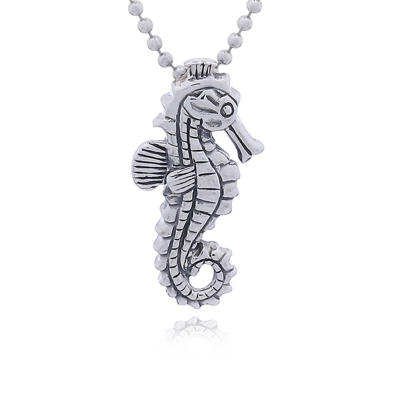 Detailed Sterling Silver seahorse charm pendant showcases its superbly ornamented pattern fins and facial features that create an authentic looking miniature seahorse that ranks high on the popularity list. The recessed antique finish sections make the bright shining authentic looking pattern stand out dangling on the welded ring linked to the bail this Planet Silver designer charm looks gorgeous on the chain. Crafted of Hallmarked 925 silver this lovely silver jewelry is for the people that have an affinity with the oceans and the sea and is embellishing men and women yet teens and children love it and are big fans too.