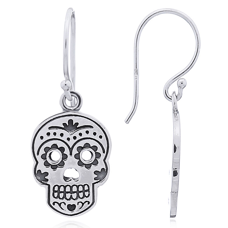 Sugar skulls are a part of the Mexican Day of the Dead. 925 silver sugar skull earrings adorned with darkened grooves and dots round the eye sockets chin forehead and cheeks proudly sporting an unibrow. The unibrow makes a reference to Frida Kahlo a Mexican artist who is now celebrated as a feminist icon.