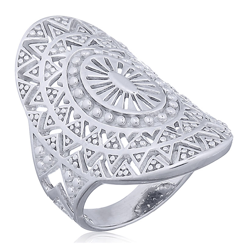 This sun mandala ring features a sleek rhodium-plated finish, providing a modern touch to a classic design. Retailers will appreciate its versatility, appealing to customers seeking contemporary yet timeless accessories.