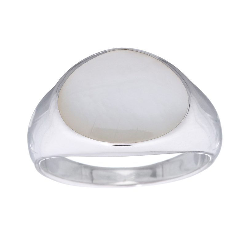 This 925 sterling silver ring features a striking round asymmetrical triangle design with a smooth mother of pearl inlay in a secure bezel setting. Retailers will value its modern elegance, perfect for customers seeking distinctive, refined jewelry pieces.